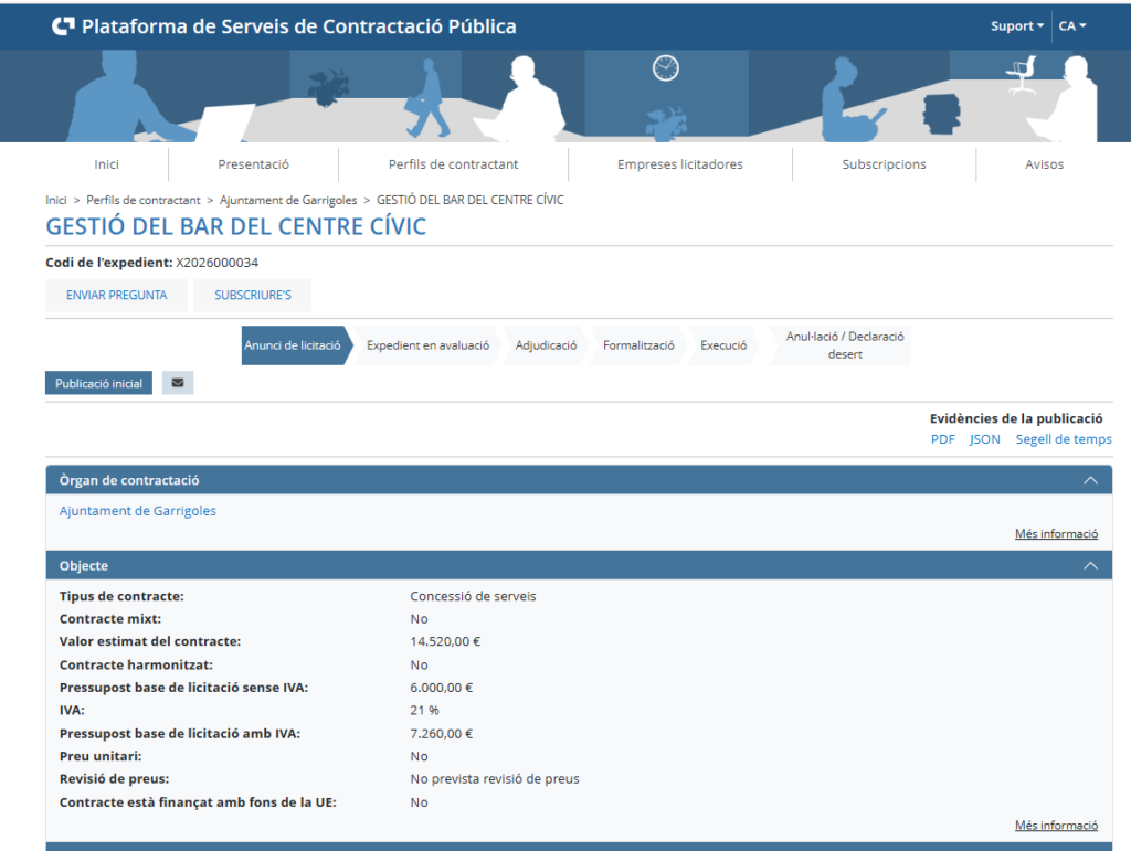 A aquesta notícia podreu trobar la informació relacionada amb la licitació “Gestió del Bar del Centre Cívic, Les Olives”.